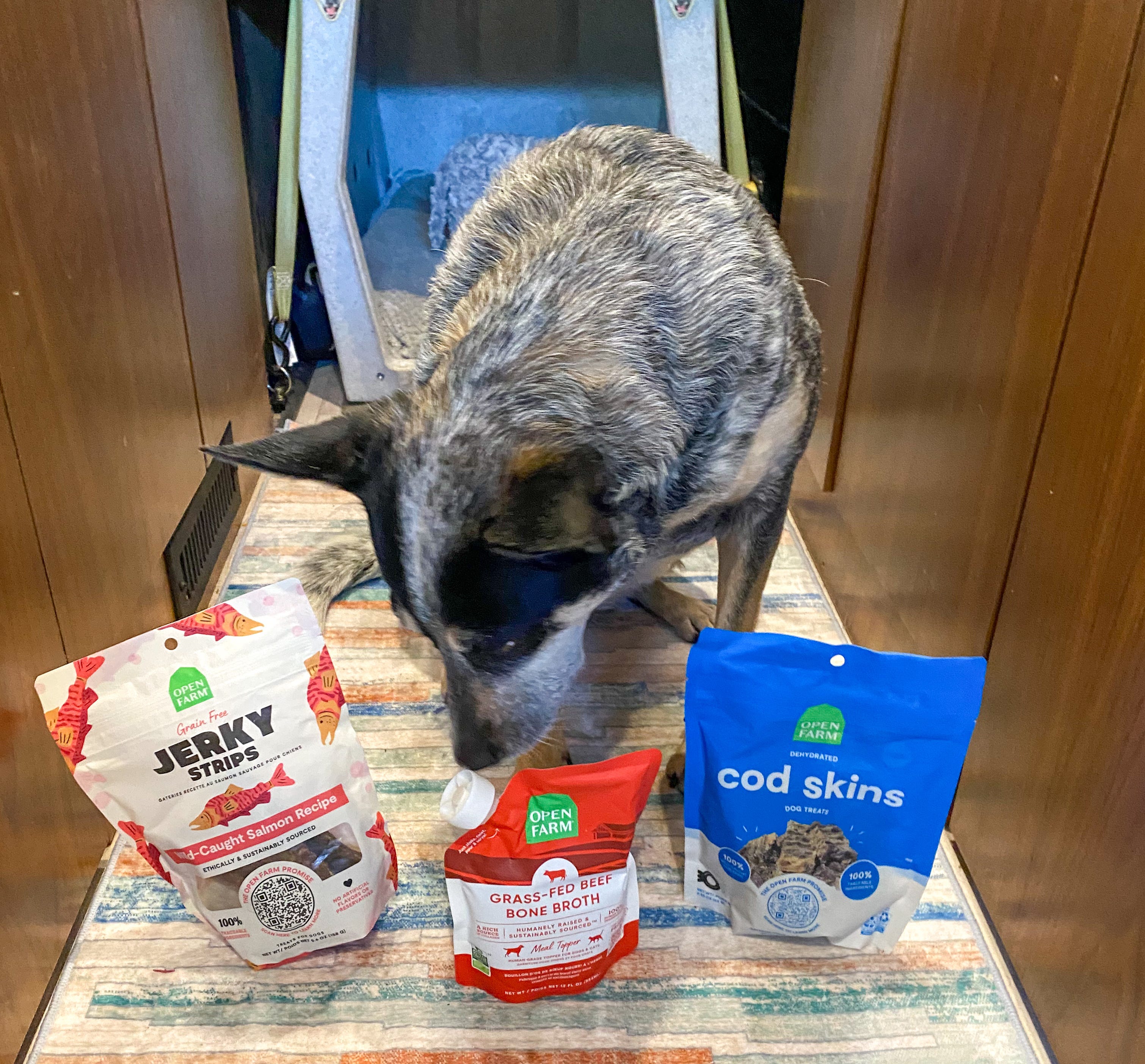 Open Farm sent us a gifted (no strings attached, no requirement to share) package in November 2024. Scout was so excited about the good smells that she tore through the cardboard herself, opened the bag of dog food, and ate her fill before falling asleep on the bed when we stepped out of the van for a minute 😅 It was unusual of her… and a testament to how much she enjoys this brand. After that we officially became part of their ambassador program in December.