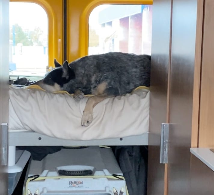 I let her come to the front to see what was going on. She growled for a moment more, I sent her back to her crate, and within thirty seconds she quieted. Another minute later she was lying on our bed, eyes soft, not bothered enough to lift her head as strangers opened the driver’s door to pop the hood and circled the van for safety checks and otherwise made a small ruckus. She stayed like that until we drove away.