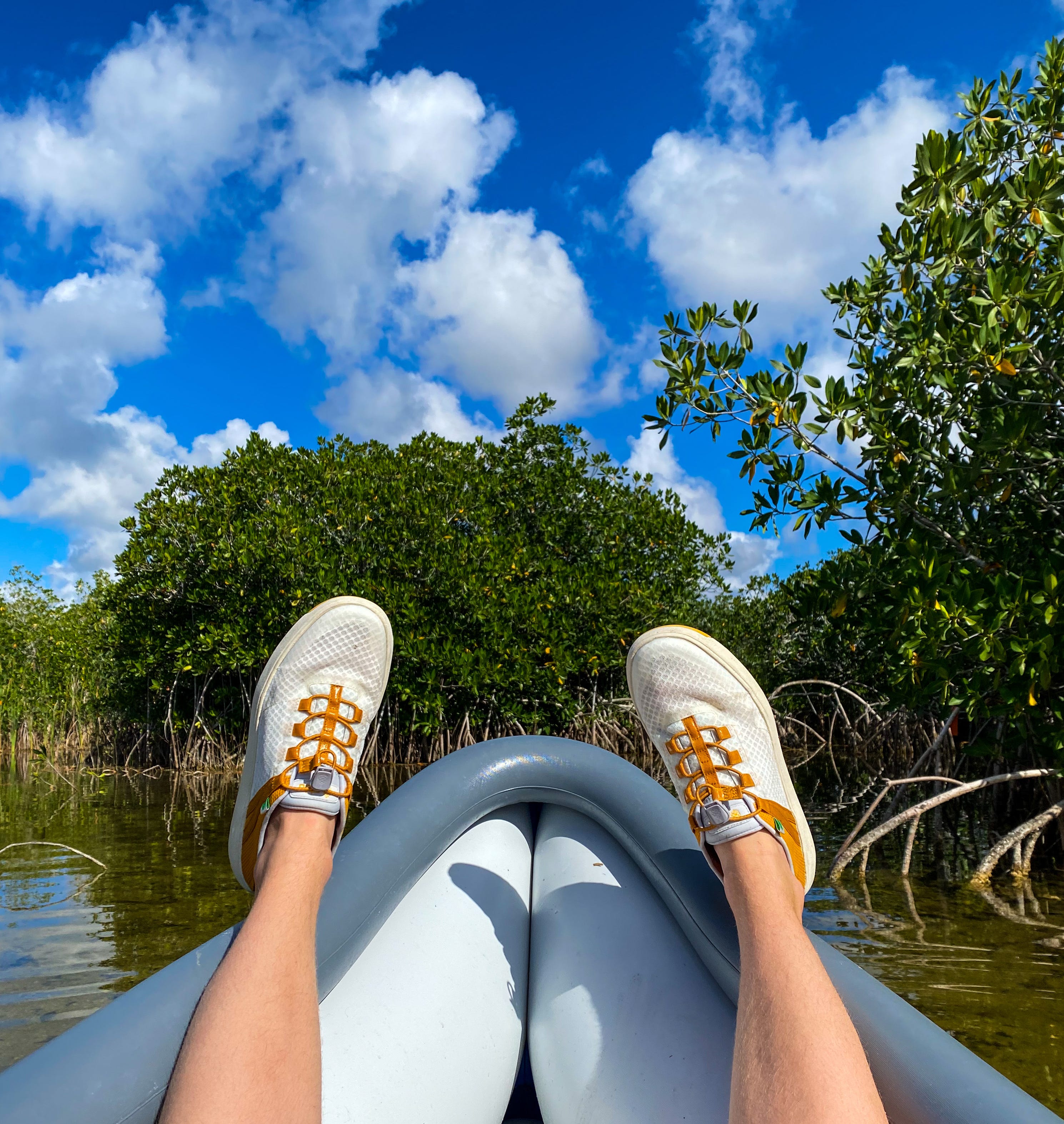 Paddling a designated mangrove trail, I cringe as our inflatable kayak rubs the bottom of the pond. “We’re stirring up the mud,” I worry aloud. “How many organisms call this mud home?” Sean shakes his head.