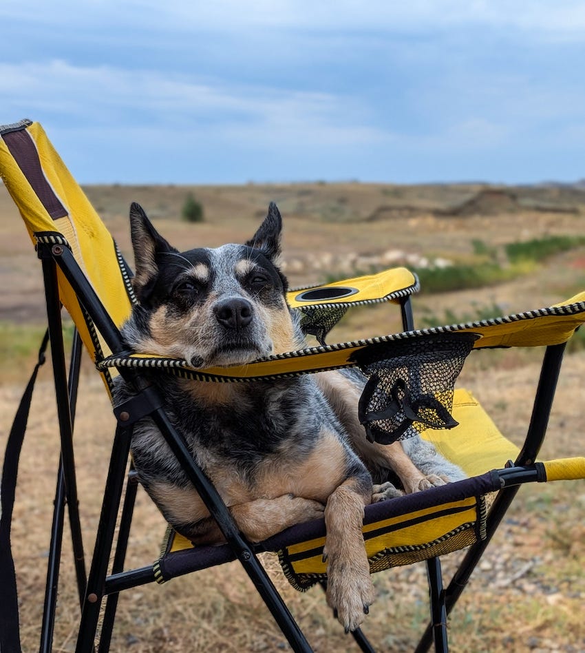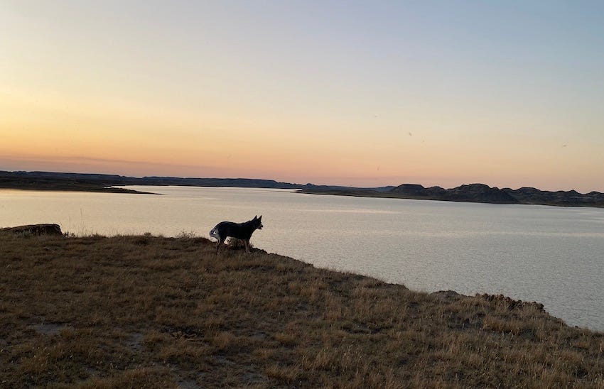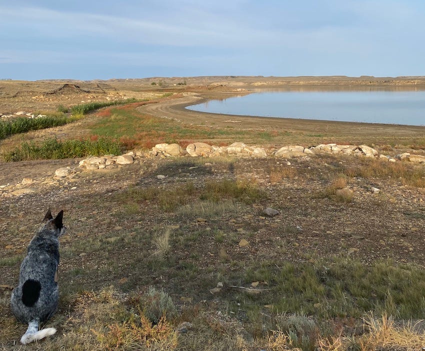 Scout looks good in a place like this. I love the pale sun on her fur, flecks of dust reflecting the rays; her soft squinty eyes; the stark contrast of her graying-but-still-black ears against the lake on the horizon. She looks good here, and she feels good here. She has seemed strong since we drove into this deserted recreation area past hundreds of prairie dogs and dozens of cows and a single burrowing owl.