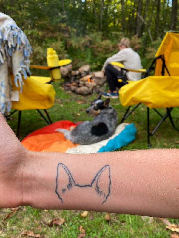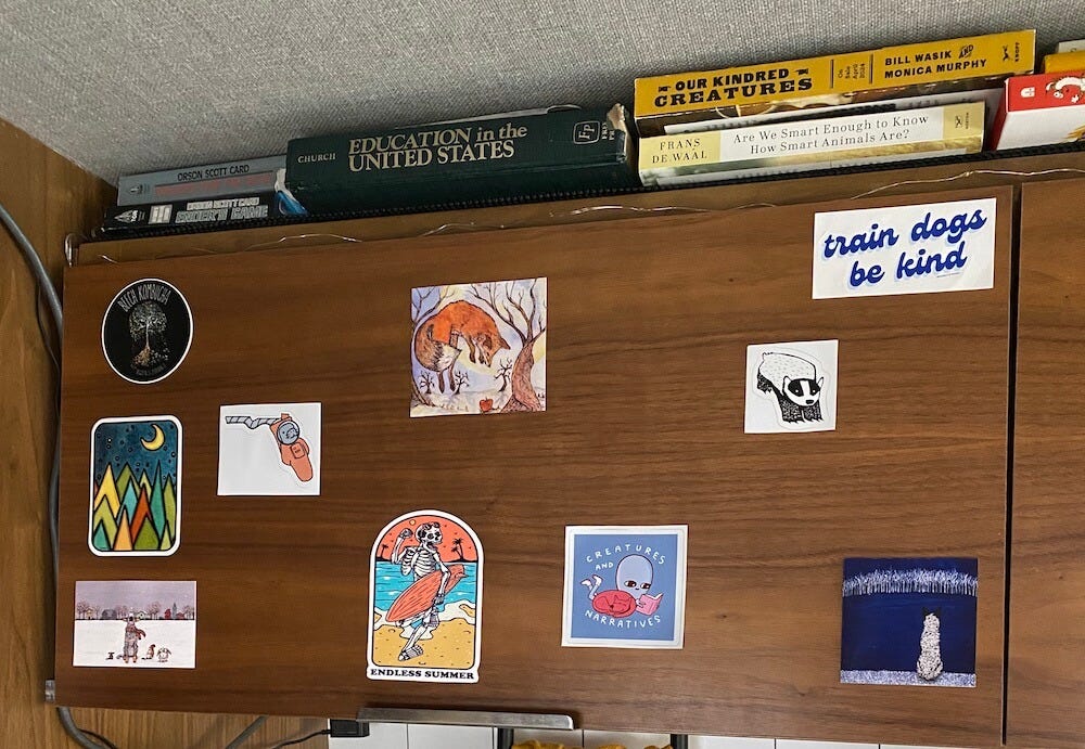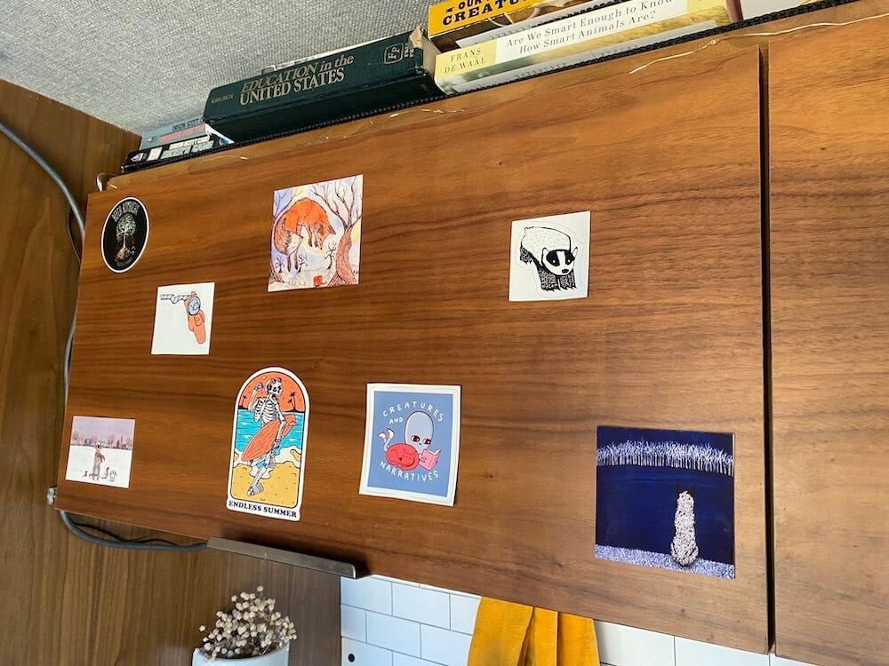 Except that on the front of it we’ve taped several stickers and pieces of art. They’re some of the first things you see when you enter our house. One of them is the label from a bottle of dry cider I loved — I painstakingly warmed the wrapping with a hairdryer so I could peel it whole from the glass and attach it to a stronger piece of paper. One of them is a sticker from a kombucha brewery we visited twice within a week on the gulf coast of Florida. Three of them are silly doodles by Nathan Pyle, the author of the Strange Planet comics and one of my favorite sources of wholesome joy on the internet. Two are illustrations from Artwork by AK, a fellow cattle dog lover. The rest we’ve just picked up along the way.